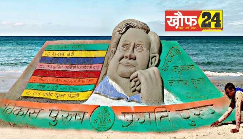 दरभंगा, (खौफ 24) महिलाओं के खाते में सीधे 10000 रुपए पहुंचने के बाद एक बार बिहार में बहार आ गया हैं। महिलाओं में खुशी का लहर हैं। इधर देश देश के चर्चित अंतरराष्ट्रीय रेत कलाकार मधुरेंद्र कुमार ने भी सरकार के सम्मान में अपनी कठिन परिश्रम के बाद लगभग 30 टन गंगा बालू के रेत पर मुख्यमंत्री नीतीश कुमार की मनमोहक तस्वीर बनाई और लिखा “धन्यवाद! मुख्यमंत्री नीतीश कुमार” मधुरेंद्र को इस कलाकृति का निर्माण करने में 36 घंटे का समय लगा है। मुख्यमंत्री के इस बेमिसाल कलाकृति को तैयार करने में 30 हजार किलोग्राम बालू का उपयोग किया है। जिसकी ऊंचाई 10 फिट हैं जबकि लंबाई 20 फिट हैं। इंटरनेशनल सैंड आर्टिस्ट मधुरेंद्र ने खासकर अपनी विशेष कलाकृति के जरिए प्रगति के पथ पर बढ़ते बिहार के सपने को साकार होते हुए देखकर खुशी जाहिर करते हुए भारत के प्रधानमंत्री नरेंद्र मोदी और बिहार के मुख्यमंत्री नीतीश कुमार को विशेष बधाई दी है। मधुरेंद्र के इस कलाकृति को देखने के लिए भारी संख्या में लोगों की हुजूम उमड़ पड़ी। लोग अपने मोबाइल फोन में तस्वीरें कैद कर सोशल मीडिया पर साझा कर रहे हैं, जिससे यह तस्वीर सोशल मीडिया पर तेजी वायरल हो रही हैं।